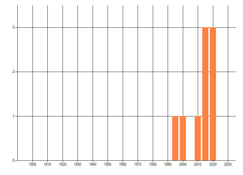 Het aantal atlasblokken (5x5 km) waarin de soort is gemeld binnen een periode van vijf jaar (vanaf 1980) of twintig jaar. Niet gecorrigeerd voor waarnemersinspanning en het aantal doorgegeven waarnemingen kan sterk variëren per periode, dus een trend in verspreiding kan hier niet direct uit worden afgelezen. Het opgegeven jaartal is het eerste jaar van de periode. Bron: gevalideerde waarnemingen uit de NDFF.