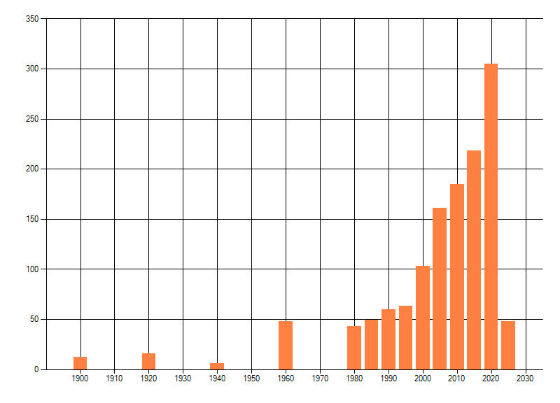 Het aantal atlasblokken (5x5 km) waarin de soort is gemeld binnen een periode van vijf jaar (vanaf 1980) of twintig jaar. Niet gecorrigeerd voor waarnemersinspanning en het aantal doorgegeven waarnemingen kan sterk variëren per periode, dus een trend in verspreiding kan hier niet direct uit worden afgelezen. Het opgegeven jaartal is het eerste jaar van de periode. Bron: gevalideerde waarnemingen uit de NDFF.