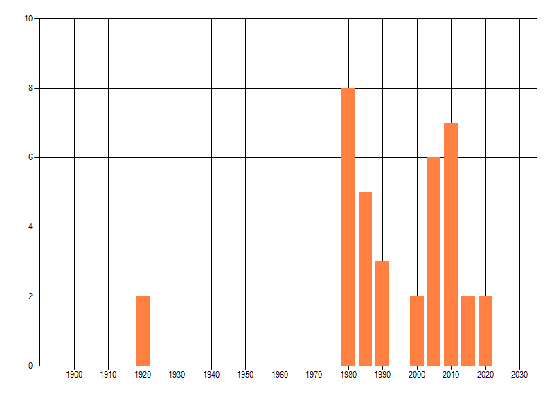 Het aantal atlasblokken (5x5 km) waarin de soort is gemeld binnen een periode van vijf jaar (vanaf 1980) of twintig jaar. Niet gecorrigeerd voor waarnemersinspanning en het aantal doorgegeven waarnemingen kan sterk variëren per periode, dus een trend in verspreiding kan hier niet direct uit worden afgelezen. Het opgegeven jaartal is het eerste jaar van de periode. Bron: gevalideerde waarnemingen uit de NDFF.