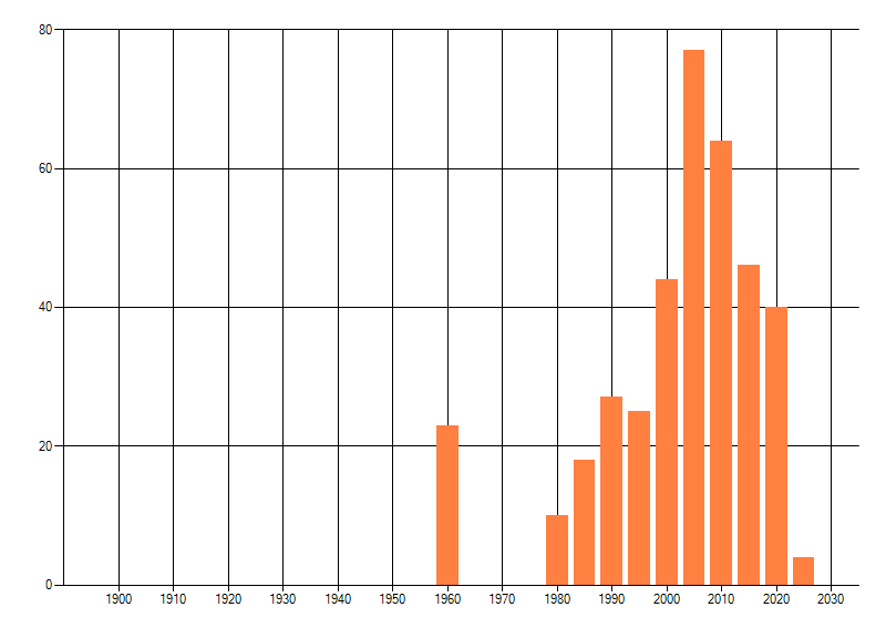 Het aantal atlasblokken (5x5 km) waarin de soort is gemeld binnen een periode van vijf jaar (vanaf 1980) of twintig jaar. Niet gecorrigeerd voor waarnemersinspanning en het aantal doorgegeven waarnemingen kan sterk variëren per periode, dus een trend in verspreiding kan hier niet direct uit worden afgelezen. Het opgegeven jaartal is het eerste jaar van de periode. Bron: gevalideerde waarnemingen uit de NDFF.