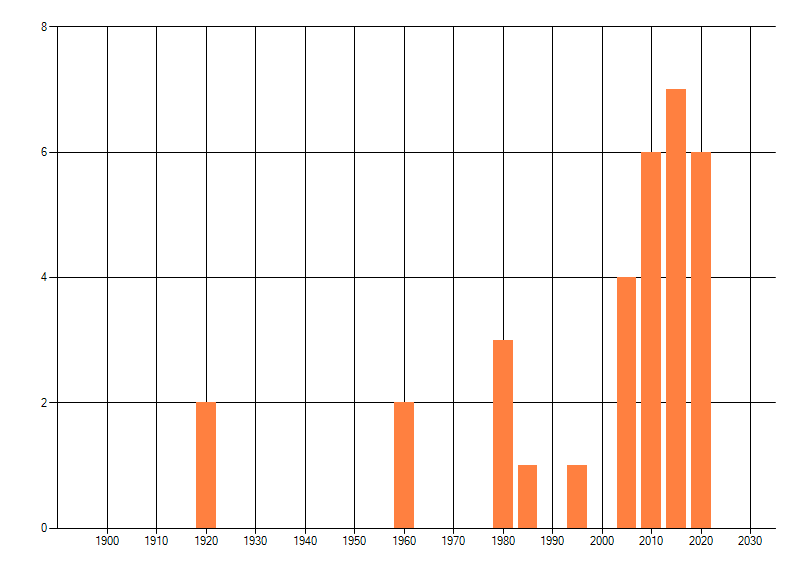 Het aantal atlasblokken (5x5 km) waarin de soort is gemeld binnen een periode van vijf jaar (vanaf 1980) of twintig jaar. Niet gecorrigeerd voor waarnemersinspanning en het aantal doorgegeven waarnemingen kan sterk variëren per periode, dus een trend in verspreiding kan hier niet direct uit worden afgelezen. Het opgegeven jaartal is het eerste jaar van de periode. Bron: gevalideerde waarnemingen uit de NDFF.