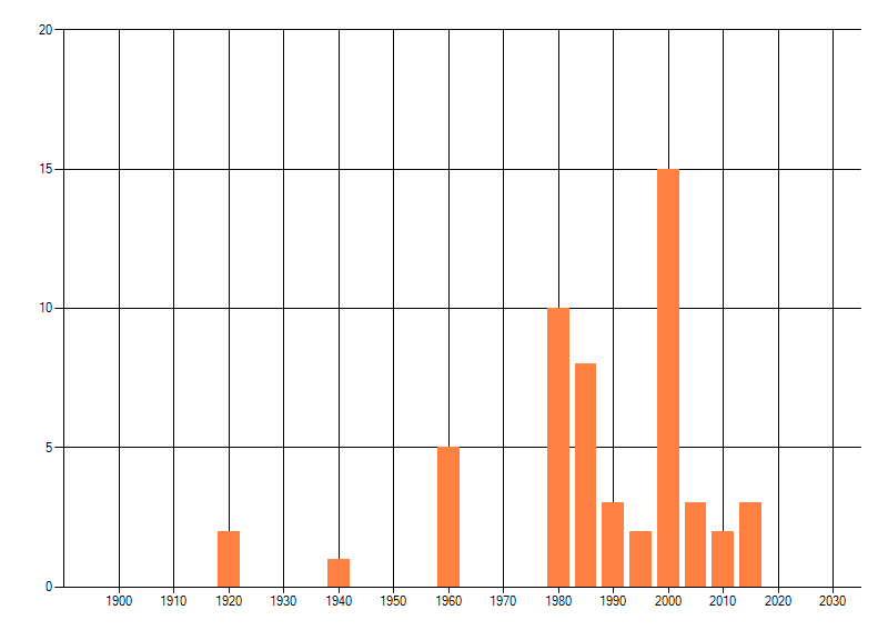Het aantal atlasblokken (5x5 km) waarin de soort is gemeld binnen een periode van vijf jaar (vanaf 1980) of twintig jaar. Niet gecorrigeerd voor waarnemersinspanning en het aantal doorgegeven waarnemingen kan sterk variëren per periode, dus een trend in verspreiding kan hier niet direct uit worden afgelezen. Het opgegeven jaartal is het eerste jaar van de periode. Bron: gevalideerde waarnemingen uit de NDFF.