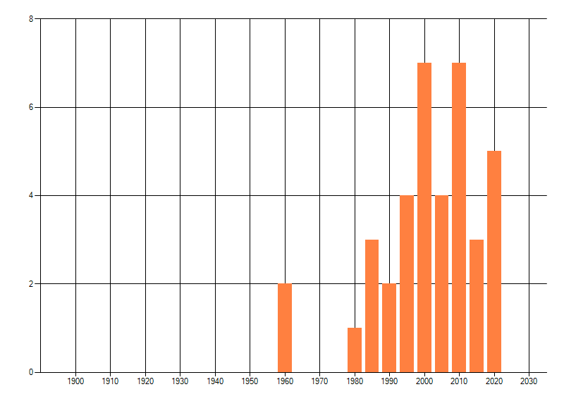 Het aantal atlasblokken (5x5 km) waarin de soort is gemeld binnen een periode van vijf jaar (vanaf 1980) of twintig jaar. Niet gecorrigeerd voor waarnemersinspanning en het aantal doorgegeven waarnemingen kan sterk variëren per periode, dus een trend in verspreiding kan hier niet direct uit worden afgelezen. Het opgegeven jaartal is het eerste jaar van de periode. Bron: gevalideerde waarnemingen uit de NDFF.