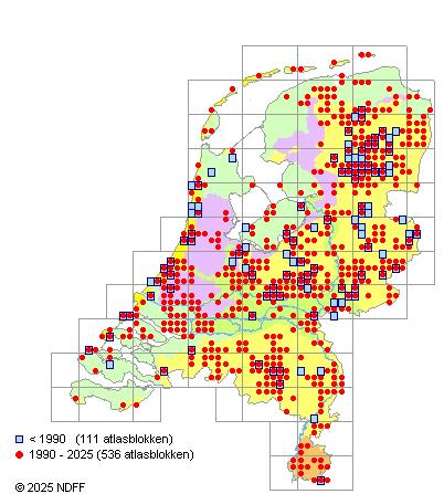 Het aantal atlasblokken (5x5 km) waarin de soort is gemeld binnen een periode van vijf jaar (vanaf 1980) of twintig jaar. Niet gecorrigeerd voor waarnemersinspanning en het aantal doorgegeven waarnemingen kan sterk variëren per periode, dus een trend in verspreiding kan hier niet direct uit worden afgelezen. Het opgegeven jaartal is het eerste jaar van de periode. Bron: gevalideerde waarnemingen uit de NDFF.