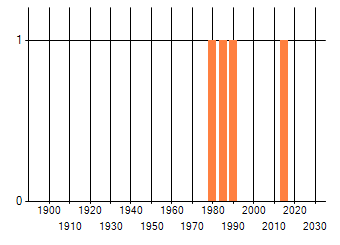 Het aantal atlasblokken (5x5 km) waarin de soort is gemeld binnen een periode van vijf jaar (vanaf 1980) of twintig jaar. Niet gecorrigeerd voor waarnemersinspanning en het aantal doorgegeven waarnemingen kan sterk variëren per periode, dus een trend in verspreiding kan hier niet direct uit worden afgelezen. Het opgegeven jaartal is het eerste jaar van de periode. Bron: gevalideerde waarnemingen uit de NDFF.