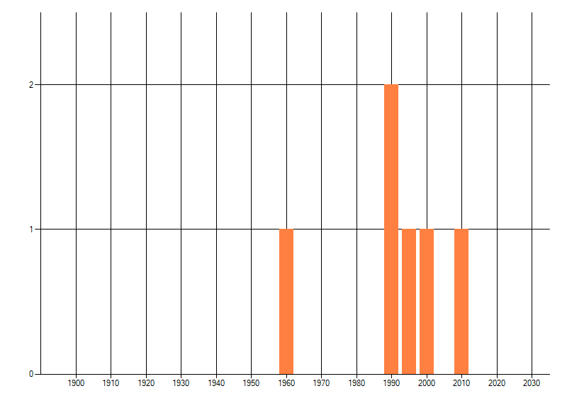 Het aantal atlasblokken (5x5 km) waarin de soort is gemeld binnen een periode van vijf jaar (vanaf 1980) of twintig jaar. Niet gecorrigeerd voor waarnemersinspanning en het aantal doorgegeven waarnemingen kan sterk variëren per periode, dus een trend in verspreiding kan hier niet direct uit worden afgelezen. Het opgegeven jaartal is het eerste jaar van de periode. Bron: gevalideerde waarnemingen uit de NDFF.