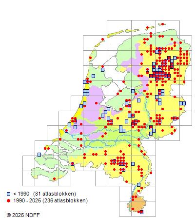 Het aantal atlasblokken (5x5 km) waarin de soort is gemeld binnen een periode van vijf jaar (vanaf 1980) of twintig jaar. Niet gecorrigeerd voor waarnemersinspanning en het aantal doorgegeven waarnemingen kan sterk variëren per periode, dus een trend in verspreiding kan hier niet direct uit worden afgelezen. Het opgegeven jaartal is het eerste jaar van de periode. Bron: gevalideerde waarnemingen uit de NDFF.
