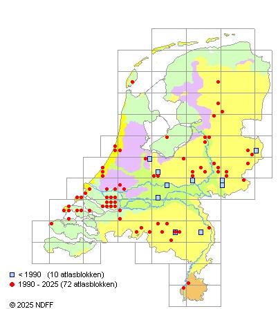 Het aantal atlasblokken (5x5 km) waarin de soort is gemeld binnen een periode van vijf jaar (vanaf 1980) of twintig jaar. Niet gecorrigeerd voor waarnemersinspanning en het aantal doorgegeven waarnemingen kan sterk variëren per periode, dus een trend in verspreiding kan hier niet direct uit worden afgelezen. Het opgegeven jaartal is het eerste jaar van de periode. Bron: gevalideerde waarnemingen uit de NDFF.