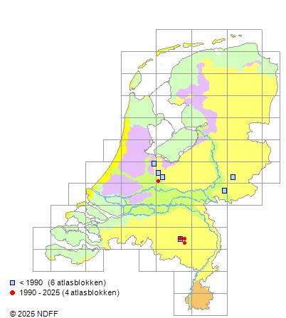 Het aantal atlasblokken (5x5 km) waarin de soort is gemeld binnen een periode van vijf jaar (vanaf 1980) of twintig jaar. Niet gecorrigeerd voor waarnemersinspanning en het aantal doorgegeven waarnemingen kan sterk variëren per periode, dus een trend in verspreiding kan hier niet direct uit worden afgelezen. Het opgegeven jaartal is het eerste jaar van de periode. Bron: gevalideerde waarnemingen uit de NDFF.