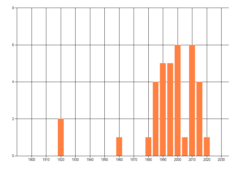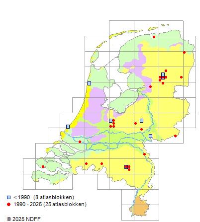 Het aantal atlasblokken (5x5 km) waarin de soort is gemeld binnen een periode van vijf jaar (vanaf 1980) of twintig jaar. Niet gecorrigeerd voor waarnemersinspanning en het aantal doorgegeven waarnemingen kan sterk variëren per periode, dus een trend in verspreiding kan hier niet direct uit worden afgelezen. Het opgegeven jaartal is het eerste jaar van de periode. Bron: gevalideerde waarnemingen uit de NDFF.