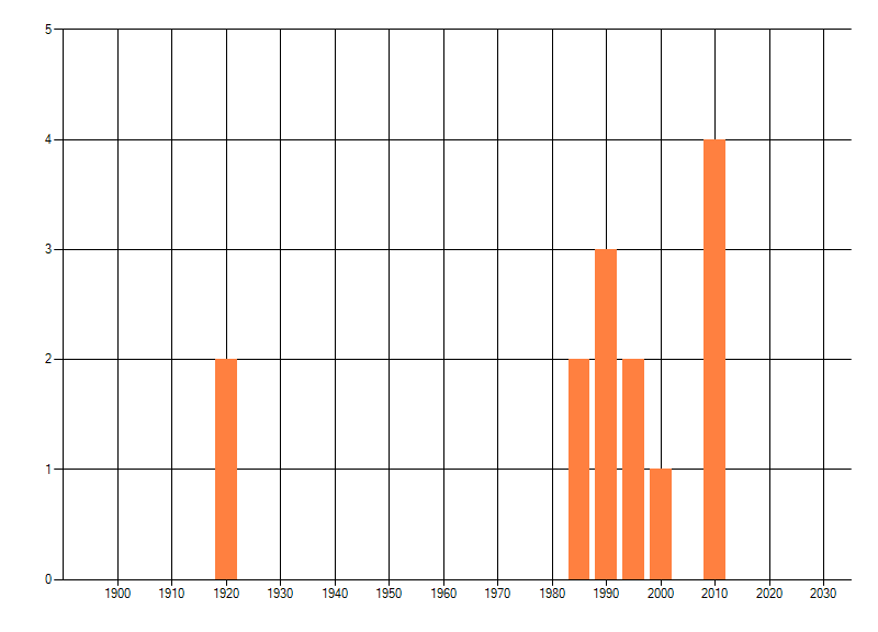 Het aantal atlasblokken (5x5 km) waarin de soort is gemeld binnen een periode van vijf jaar (vanaf 1980) of twintig jaar. Niet gecorrigeerd voor waarnemersinspanning en het aantal doorgegeven waarnemingen kan sterk variëren per periode, dus een trend in verspreiding kan hier niet direct uit worden afgelezen. Het opgegeven jaartal is het eerste jaar van de periode. Bron: gevalideerde waarnemingen uit de NDFF.