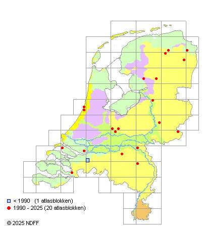 Het aantal atlasblokken (5x5 km) waarin de soort is gemeld binnen een periode van vijf jaar (vanaf 1980) of twintig jaar. Niet gecorrigeerd voor waarnemersinspanning en het aantal doorgegeven waarnemingen kan sterk variëren per periode, dus een trend in verspreiding kan hier niet direct uit worden afgelezen. Het opgegeven jaartal is het eerste jaar van de periode. Bron: gevalideerde waarnemingen uit de NDFF.