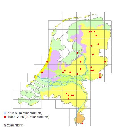 Het aantal atlasblokken (5x5 km) waarin de soort is gemeld binnen een periode van vijf jaar (vanaf 1980) of twintig jaar. Niet gecorrigeerd voor waarnemersinspanning en het aantal doorgegeven waarnemingen kan sterk variëren per periode, dus een trend in verspreiding kan hier niet direct uit worden afgelezen. Het opgegeven jaartal is het eerste jaar van de periode. Bron: gevalideerde waarnemingen uit de NDFF.