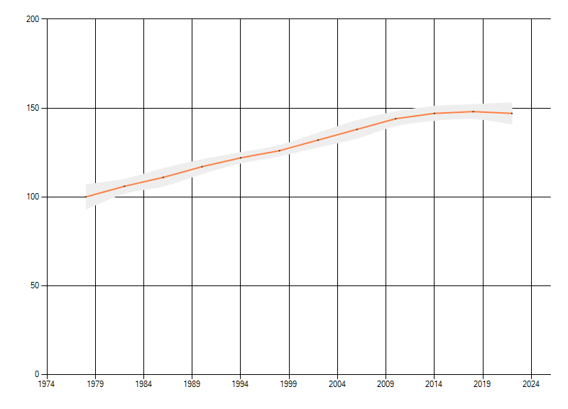 Gemiddelde trend van het aantal kilometerhokken waarin de soort voorkomt, weergegeven als indexcijfer (1975-1978 = 100).