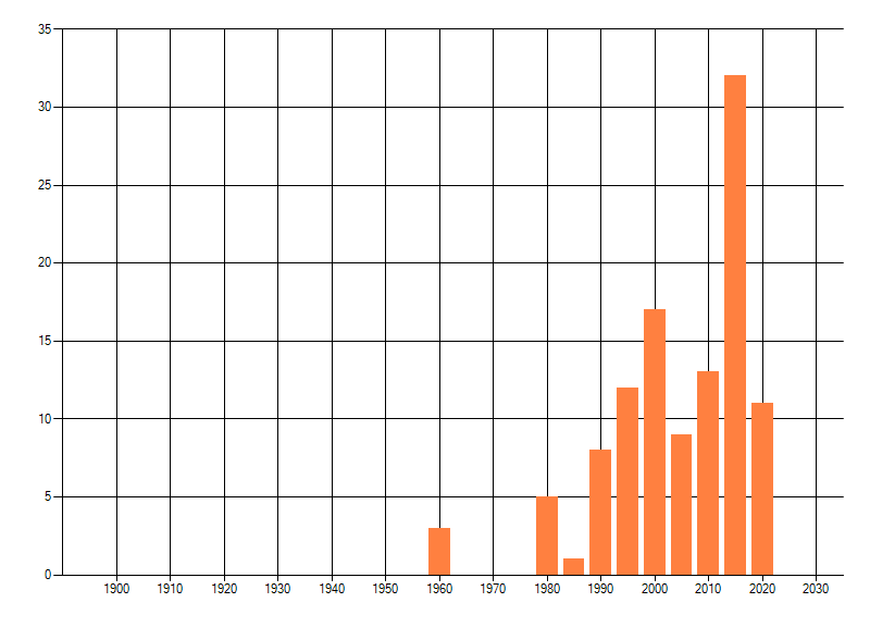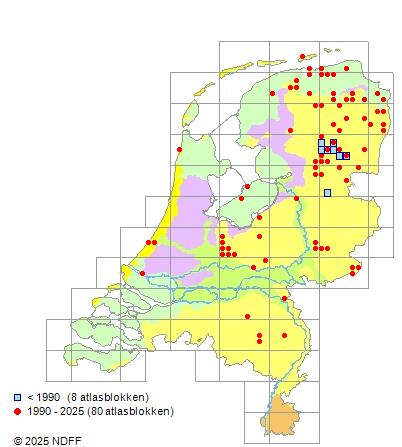 Het aantal atlasblokken (5x5 km) waarin de soort is gemeld binnen een periode van vijf jaar (vanaf 1980) of twintig jaar. Niet gecorrigeerd voor waarnemersinspanning en het aantal doorgegeven waarnemingen kan sterk variëren per periode, dus een trend in verspreiding kan hier niet direct uit worden afgelezen. Het opgegeven jaartal is het eerste jaar van de periode. Bron: gevalideerde waarnemingen uit de NDFF.