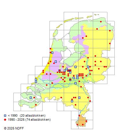 Het aantal atlasblokken (5x5 km) waarin de soort is gemeld binnen een periode van vijf jaar (vanaf 1980) of twintig jaar. Niet gecorrigeerd voor waarnemersinspanning en het aantal doorgegeven waarnemingen kan sterk variëren per periode, dus een trend in verspreiding kan hier niet direct uit worden afgelezen. Het opgegeven jaartal is het eerste jaar van de periode. Bron: gevalideerde waarnemingen uit de NDFF.