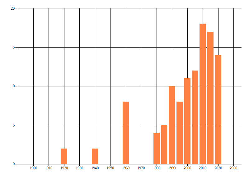 Het aantal atlasblokken (5x5 km) waarin de soort is gemeld binnen een periode van vijf jaar (vanaf 1980) of twintig jaar. Niet gecorrigeerd voor waarnemersinspanning en het aantal doorgegeven waarnemingen kan sterk variëren per periode, dus een trend in verspreiding kan hier niet direct uit worden afgelezen. Het opgegeven jaartal is het eerste jaar van de periode. Bron: gevalideerde waarnemingen uit de NDFF.