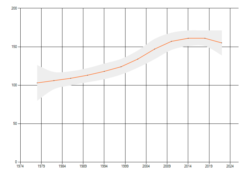 Gemiddelde trend van het aantal kilometerhokken waarin de soort voorkomt, weergegeven als indexcijfer (1975-1978 = 100).