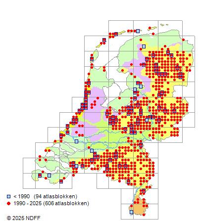 Het aantal atlasblokken (5x5 km) waarin de soort is gemeld binnen een periode van vijf jaar (vanaf 1980) of twintig jaar. Niet gecorrigeerd voor waarnemersinspanning en het aantal doorgegeven waarnemingen kan sterk variëren per periode, dus een trend in verspreiding kan hier niet direct uit worden afgelezen. Het opgegeven jaartal is het eerste jaar van de periode. Bron: gevalideerde waarnemingen uit de NDFF.