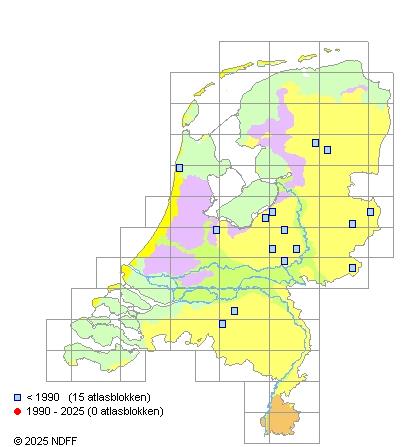 Het aantal atlasblokken (5x5 km) waarin de soort is gemeld binnen een periode van vijf jaar (vanaf 1980) of twintig jaar. Niet gecorrigeerd voor waarnemersinspanning en het aantal doorgegeven waarnemingen kan sterk variëren per periode, dus een trend in verspreiding kan hier niet direct uit worden afgelezen. Het opgegeven jaartal is het eerste jaar van de periode. Bron: gevalideerde waarnemingen uit de NDFF.