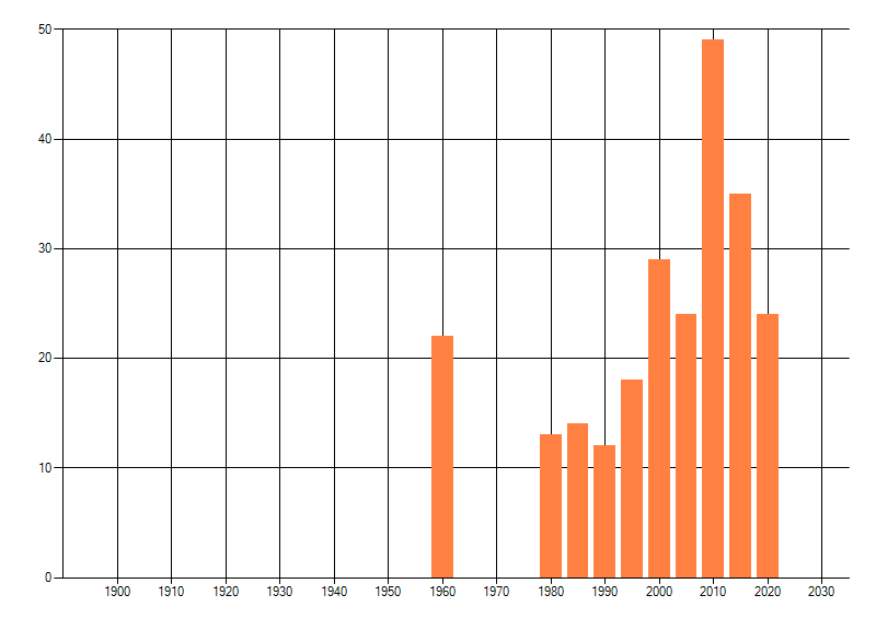 Het aantal atlasblokken (5x5 km) waarin de soort is gemeld binnen een periode van vijf jaar (vanaf 1980) of twintig jaar. Niet gecorrigeerd voor waarnemersinspanning en het aantal doorgegeven waarnemingen kan sterk variëren per periode, dus een trend in verspreiding kan hier niet direct uit worden afgelezen. Het opgegeven jaartal is het eerste jaar van de periode. Bron: gevalideerde waarnemingen uit de NDFF.