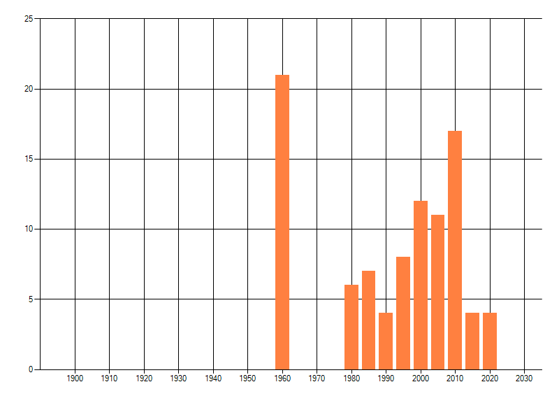 Het aantal atlasblokken (5x5 km) waarin de soort is gemeld binnen een periode van vijf jaar (vanaf 1980) of twintig jaar. Niet gecorrigeerd voor waarnemersinspanning en het aantal doorgegeven waarnemingen kan sterk variëren per periode, dus een trend in verspreiding kan hier niet direct uit worden afgelezen. Het opgegeven jaartal is het eerste jaar van de periode. Bron: gevalideerde waarnemingen uit de NDFF.