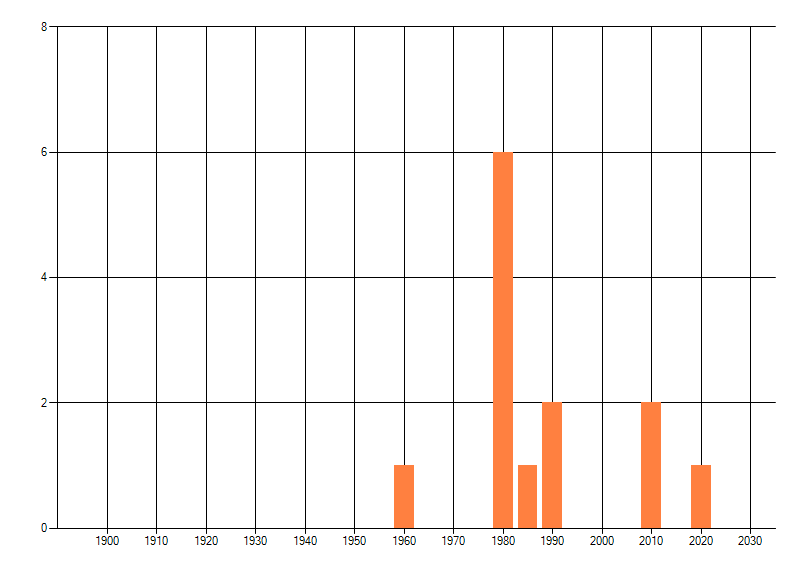 Het aantal atlasblokken (5x5 km) waarin de soort is gemeld binnen een periode van vijf jaar (vanaf 1980) of twintig jaar. Niet gecorrigeerd voor waarnemersinspanning en het aantal doorgegeven waarnemingen kan sterk variëren per periode, dus een trend in verspreiding kan hier niet direct uit worden afgelezen. Het opgegeven jaartal is het eerste jaar van de periode. Bron: gevalideerde waarnemingen uit de NDFF.
