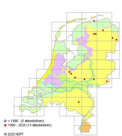 Het aantal atlasblokken (5x5 km) waarin de soort is gemeld binnen een periode van vijf jaar (vanaf 1980) of twintig jaar. Niet gecorrigeerd voor waarnemersinspanning en het aantal doorgegeven waarnemingen kan sterk variëren per periode, dus een trend in verspreiding kan hier niet direct uit worden afgelezen. Het opgegeven jaartal is het eerste jaar van de periode. Bron: gevalideerde waarnemingen uit de NDFF.