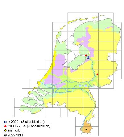CC BY-NC-SA 3.0 NLVerspreidingNederlandVroeger zeer zeldzaam langs de Waal in de omgeving van Nijmegen. Voor het laatst gevonden in 1942 bij Lent. Onlangs gevonden in een kalkgrasland in Zuid-Limburg (waarschijnlijk niet oorspronkelijk wild).
