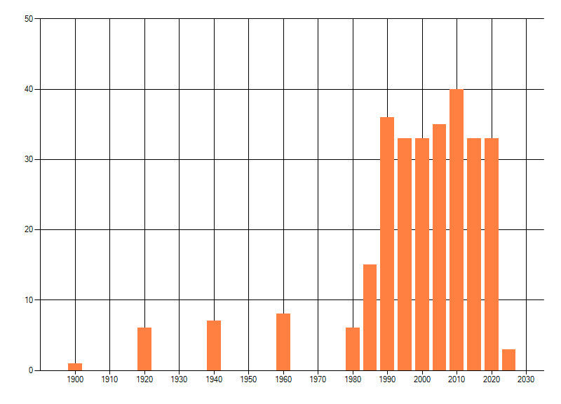 Het aantal atlasblokken (5x5 km) waarin de soort is gemeld binnen een periode van vijf jaar (vanaf 1980) of twintig jaar. Niet gecorrigeerd voor waarnemersinspanning en het aantal doorgegeven waarnemingen kan sterk variëren per periode, dus een trend in verspreiding kan hier niet direct uit worden afgelezen. Het opgegeven jaartal is het eerste jaar van de periode. Bron: gevalideerde waarnemingen uit de NDFF.