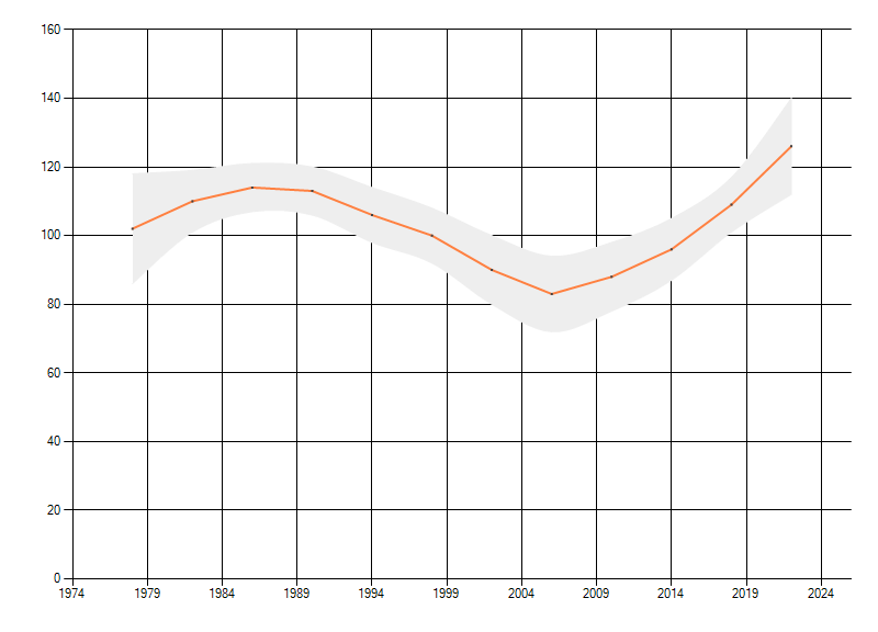 Gemiddelde trend van het aantal kilometerhokken waarin de soort voorkomt, weergegeven als indexcijfer (1975-1978 = 100).