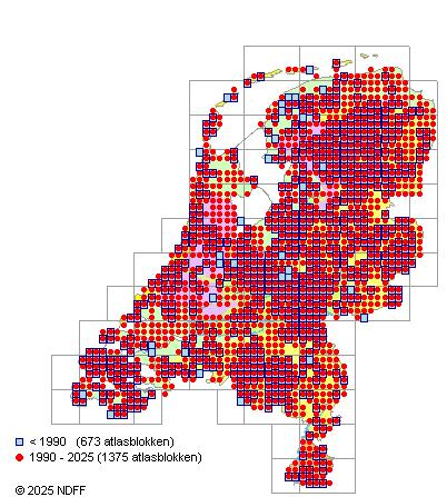 Het aantal atlasblokken (5x5 km) waarin de soort is gemeld binnen een periode van vijf jaar (vanaf 1980) of twintig jaar.