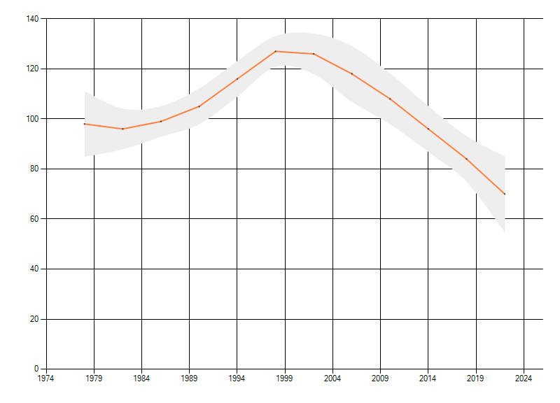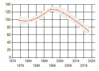 Gemiddelde trend van het aantal kilometerhokken waarin de soort voorkomt, weergegeven als indexcijfer (1975-1978 = 100).