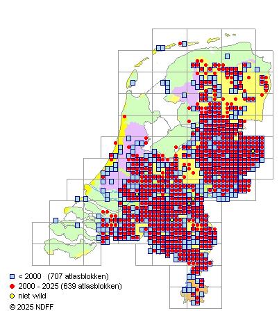 CC BY-NC-SA 3.0 NLVerspreidingNederlandVrij algemeen in het oosten en midden van het land en in laagveengebieden en vrij zeldzaam in het rivierengebied. Elders zeldzaam tot zeer zeldzaam.