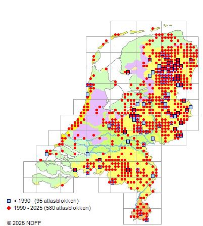 Het aantal atlasblokken (5x5 km) waarin de soort is gemeld binnen een periode van vijf jaar (vanaf 1980) of twintig jaar. Niet gecorrigeerd voor waarnemersinspanning en het aantal doorgegeven waarnemingen kan sterk variƫren per periode, dus een trend in verspreiding kan hier niet direct uit worden afgelezen. Het opgegeven jaartal is het eerste jaar van de periode. Bron: gevalideerde waarnemingen uit de NDFF.