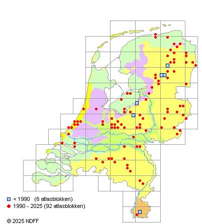 Het aantal atlasblokken (5x5 km) waarin de soort is gemeld binnen een periode van vijf jaar (vanaf 1980) of twintig jaar. Niet gecorrigeerd voor waarnemersinspanning en het aantal doorgegeven waarnemingen kan sterk variëren per periode, dus een trend in verspreiding kan hier niet direct uit worden afgelezen. Het opgegeven jaartal is het eerste jaar van de periode. Bron: gevalideerde waarnemingen uit de NDFF.