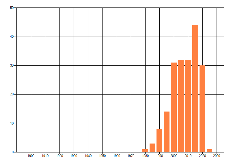 Het aantal atlasblokken (5x5 km) waarin de soort is gemeld binnen een periode van vijf jaar (vanaf 1980) of twintig jaar. Niet gecorrigeerd voor waarnemersinspanning en het aantal doorgegeven waarnemingen kan sterk variëren per periode, dus een trend in verspreiding kan hier niet direct uit worden afgelezen. Het opgegeven jaartal is het eerste jaar van de periode. Bron: gevalideerde waarnemingen uit de NDFF.