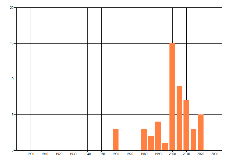 Het aantal atlasblokken (5x5 km) waarin de soort is gemeld binnen een periode van vijf jaar (vanaf 1980) of twintig jaar. Niet gecorrigeerd voor waarnemersinspanning en het aantal doorgegeven waarnemingen kan sterk variëren per periode, dus een trend in verspreiding kan hier niet direct uit worden afgelezen. Het opgegeven jaartal is het eerste jaar van de periode. Bron: gevalideerde waarnemingen uit de NDFF.