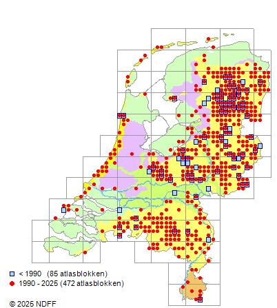 Het aantal atlasblokken (5x5 km) waarin de soort is gemeld binnen een periode van vijf jaar (vanaf 1980) of twintig jaar. Niet gecorrigeerd voor waarnemersinspanning en het aantal doorgegeven waarnemingen kan sterk variëren per periode, dus een trend in verspreiding kan hier niet direct uit worden afgelezen. Het opgegeven jaartal is het eerste jaar van de periode. Bron: gevalideerde waarnemingen uit de NDFF.