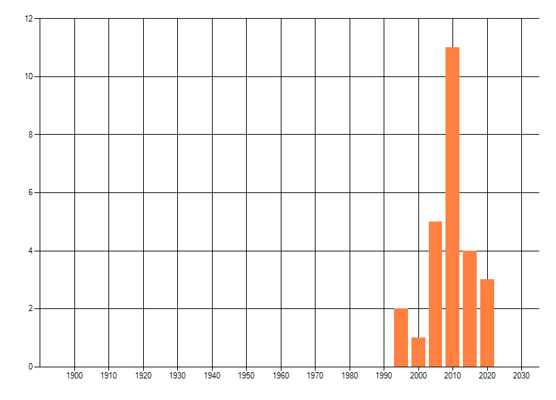 Het aantal atlasblokken (5x5 km) waarin de soort is gemeld binnen een periode van vijf jaar (vanaf 1980) of twintig jaar. Niet gecorrigeerd voor waarnemersinspanning en het aantal doorgegeven waarnemingen kan sterk variëren per periode, dus een trend in verspreiding kan hier niet direct uit worden afgelezen. Het opgegeven jaartal is het eerste jaar van de periode. Bron: gevalideerde waarnemingen uit de NDFF.