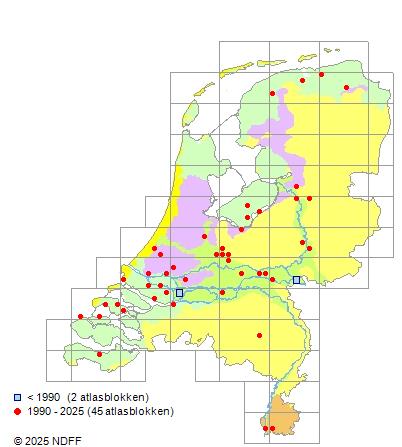 Het aantal atlasblokken (5x5 km) waarin de soort is gemeld binnen een periode van vijf jaar (vanaf 1980) of twintig jaar. Niet gecorrigeerd voor waarnemersinspanning en het aantal doorgegeven waarnemingen kan sterk variëren per periode, dus een trend in verspreiding kan hier niet direct uit worden afgelezen. Het opgegeven jaartal is het eerste jaar van de periode. Bron: gevalideerde waarnemingen uit de NDFF.