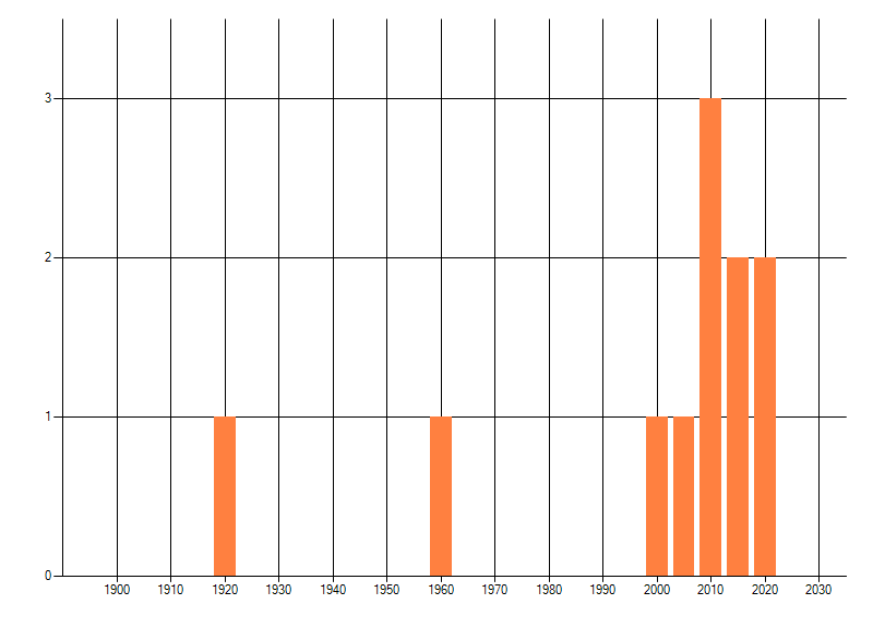 Het aantal atlasblokken (5x5 km) waarin de soort is gemeld binnen een periode van vijf jaar (vanaf 1980) of twintig jaar. Niet gecorrigeerd voor waarnemersinspanning en het aantal doorgegeven waarnemingen kan sterk variëren per periode, dus een trend in verspreiding kan hier niet direct uit worden afgelezen. Het opgegeven jaartal is het eerste jaar van de periode. Bron: gevalideerde waarnemingen uit de NDFF.
