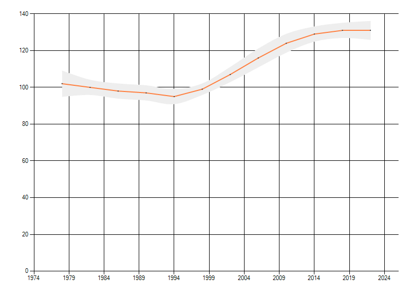 Gemiddelde trend van het aantal kilometerhokken waarin de soort voorkomt, weergegeven als indexcijfer (1975-1978 = 100).