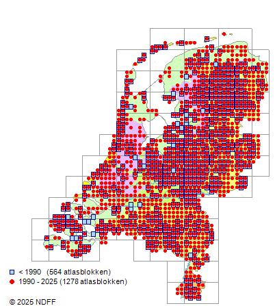 Het aantal atlasblokken (5x5 km) waarin de soort is gemeld binnen een periode van vijf jaar (vanaf 1980) of twintig jaar. Niet gecorrigeerd voor waarnemersinspanning en het aantal doorgegeven waarnemingen kan sterk variëren per periode, dus een trend in verspreiding kan hier niet direct uit worden afgelezen. Het opgegeven jaartal is het eerste jaar van de periode. Bron: gevalideerde waarnemingen uit de NDFF.