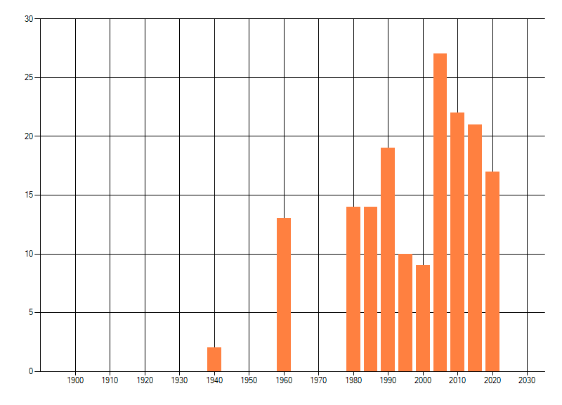 Het aantal atlasblokken (5x5 km) waarin de soort is gemeld binnen een periode van vijf jaar (vanaf 1980) of twintig jaar. Niet gecorrigeerd voor waarnemersinspanning en het aantal doorgegeven waarnemingen kan sterk variëren per periode, dus een trend in verspreiding kan hier niet direct uit worden afgelezen. Het opgegeven jaartal is het eerste jaar van de periode. Bron: gevalideerde waarnemingen uit de NDFF.