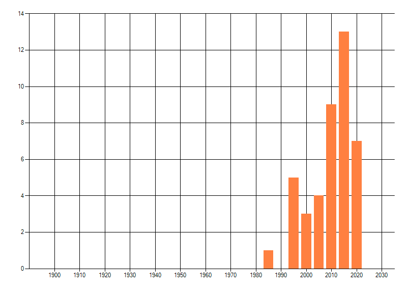 Het aantal atlasblokken (5x5 km) waarin de soort is gemeld binnen een periode van vijf jaar (vanaf 1980) of twintig jaar. Niet gecorrigeerd voor waarnemersinspanning en het aantal doorgegeven waarnemingen kan sterk variëren per periode, dus een trend in verspreiding kan hier niet direct uit worden afgelezen. Het opgegeven jaartal is het eerste jaar van de periode. Bron: gevalideerde waarnemingen uit de NDFF.