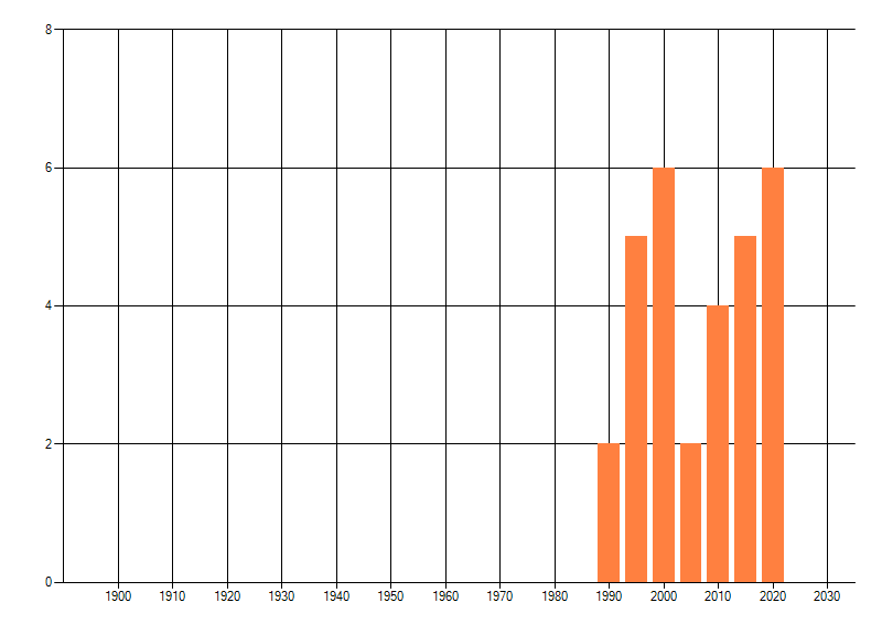 Het aantal atlasblokken (5x5 km) waarin de soort is gemeld binnen een periode van vijf jaar (vanaf 1980) of twintig jaar. Niet gecorrigeerd voor waarnemersinspanning en het aantal doorgegeven waarnemingen kan sterk variëren per periode, dus een trend in verspreiding kan hier niet direct uit worden afgelezen. Het opgegeven jaartal is het eerste jaar van de periode. Bron: gevalideerde waarnemingen uit de NDFF.