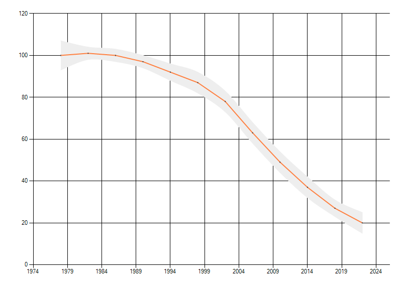 Gemiddelde trend van het aantal kilometerhokken waarin de soort voorkomt, weergegeven als indexcijfer (1975-1978 = 100).