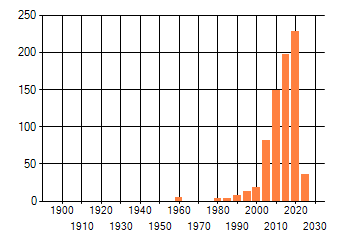 Het aantal atlasblokken (5x5 km) waarin de soort is gemeld binnen een periode van vijf jaar (vanaf 1980) of twintig jaar. Niet gecorrigeerd voor waarnemersinspanning en het aantal doorgegeven waarnemingen kan sterk variëren per periode, dus een trend in verspreiding kan hier niet direct uit worden afgelezen. Het opgegeven jaartal is het eerste jaar van de periode. Bron: gevalideerde waarnemingen uit de NDFF.