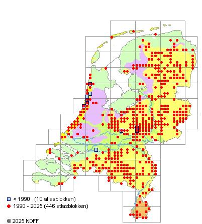 Het aantal atlasblokken (5x5 km) waarin de soort is gemeld binnen een periode van vijf jaar (vanaf 1980) of twintig jaar. Niet gecorrigeerd voor waarnemersinspanning en het aantal doorgegeven waarnemingen kan sterk variëren per periode, dus een trend in verspreiding kan hier niet direct uit worden afgelezen. Het opgegeven jaartal is het eerste jaar van de periode. Bron: gevalideerde waarnemingen uit de NDFF.